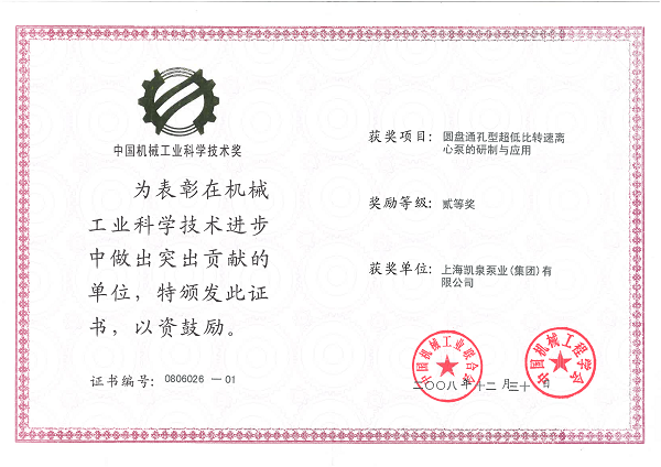 集团圆盘通孔型超低比转速离心泵的研制与应用荣获“中国机械工业科学技术二等奖”