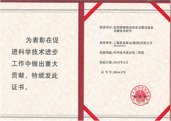 集团盐类溶液流动理论及输送装备关键技术研究荣获国家教育部颁发的“科技技术进步二等奖”