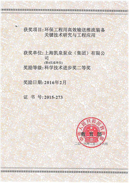 集团环保工程用高效输送推流装备关键技术研究与工程应用荣获国家教育部颁发的“科学技术进步二等奖”