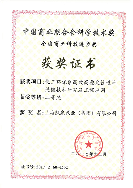 集团化工环保泵高效高稳定性设计关键技术研究及工程应用荣获“全国商业科技进步二等奖”