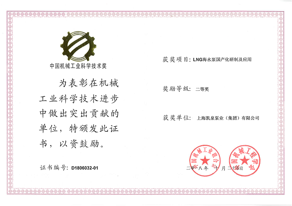 集团LNG 海水泵国产化研制及应用荣获“中国机械工业科学技术二等奖”