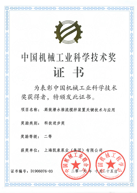 集团高效潜水推流搅拌装置关键技术与应用荣获“中国机械工业科学技术奖二等奖”