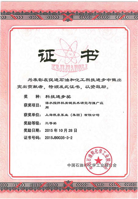 集团潜水搅拌机关键研究与推广应用荣获“科学进步三等奖”