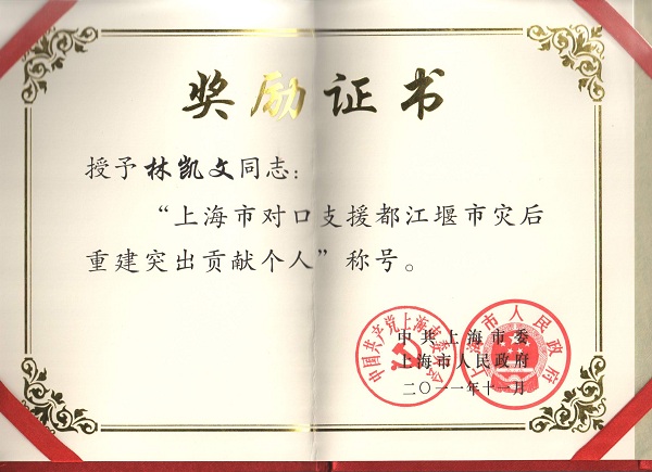 集团董事长林凯文荣获“上海市对口支援都江堰市灾后重建突出贡献个人”称号