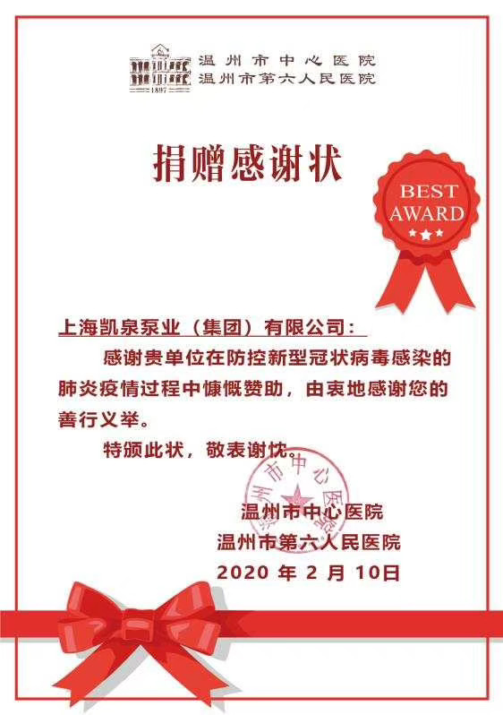 集团捐赠温州市中心医院感谢证书