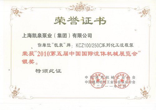 KCZ100_250C系列化工流程泵荣获_2010第五届中国国际流体机械展览会_银奖312