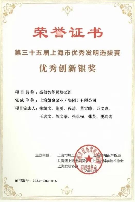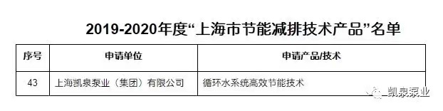 凯泉 “循环水系统高效节能技术”成功入选“上海市节能减排技术产品”
