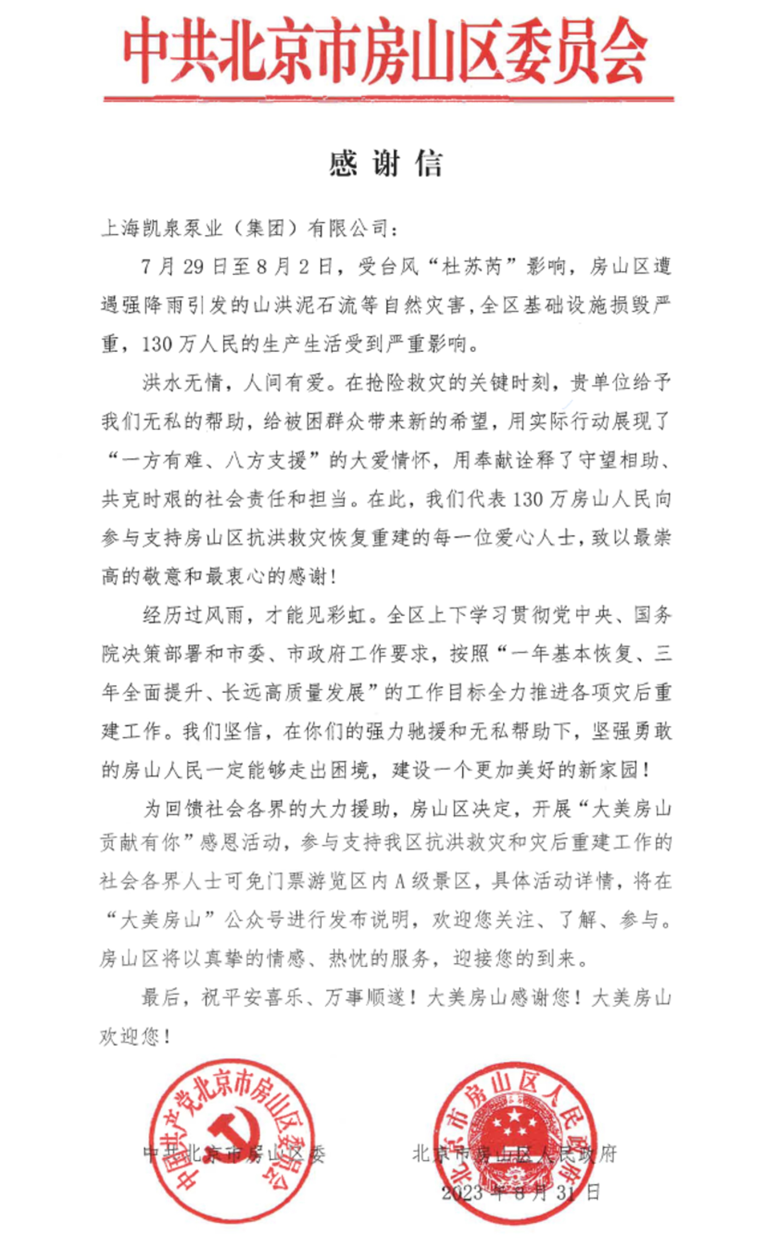 集团收到北京房山区委感谢信