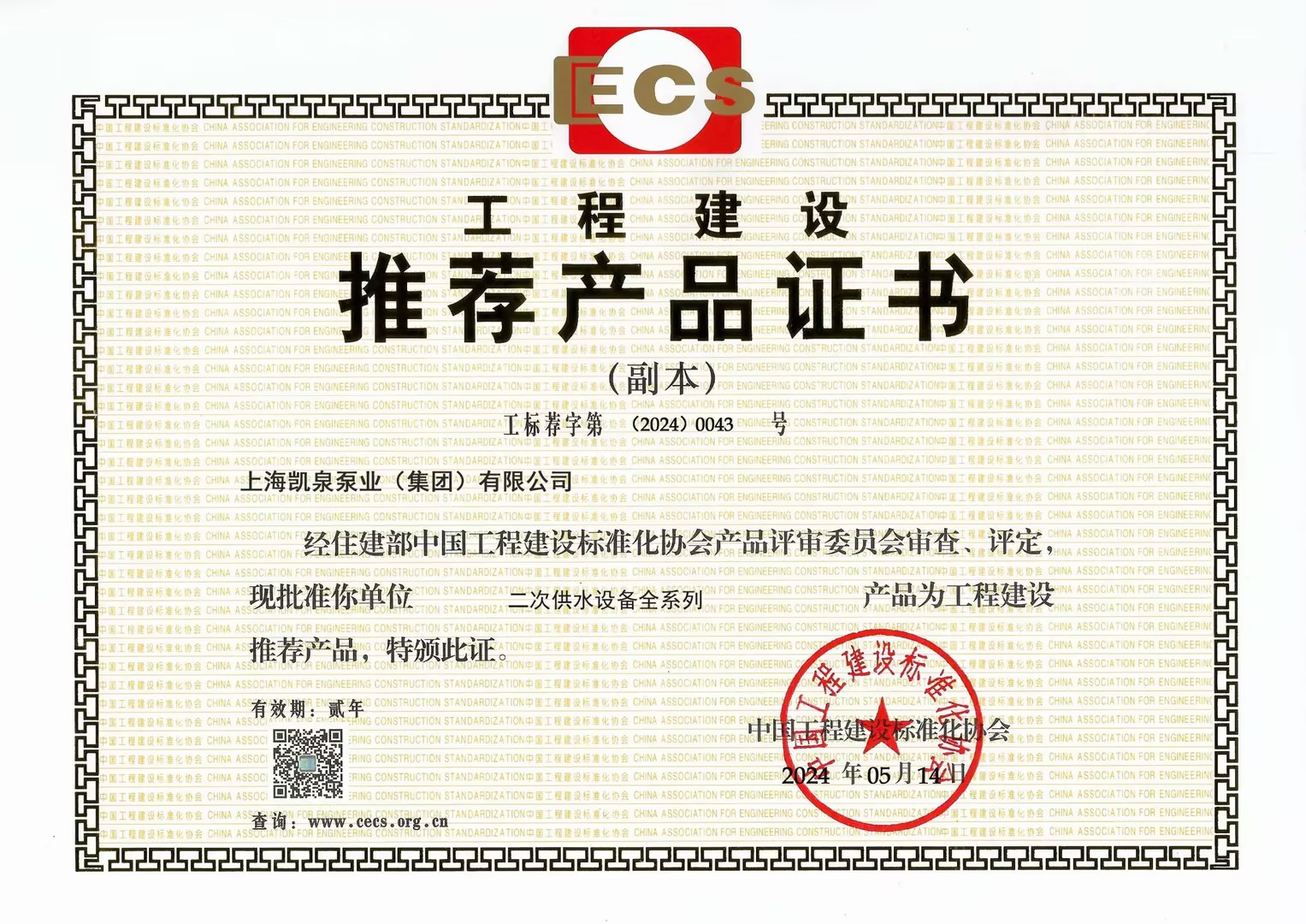 集团二次供水设备全系列荣获工程建设推荐产品证书