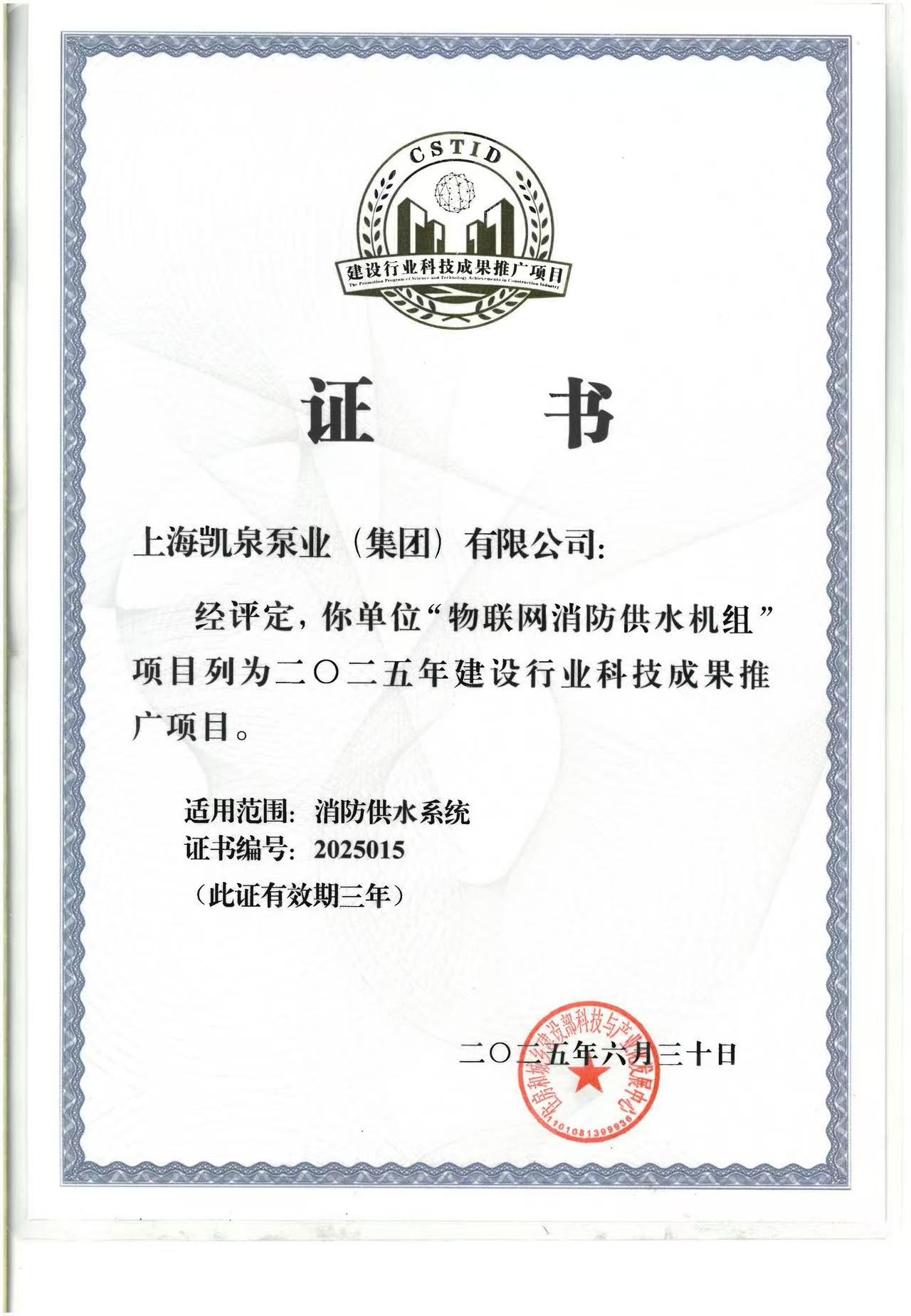集团物联网消防供水机组入选建设行业科技成果推广项目